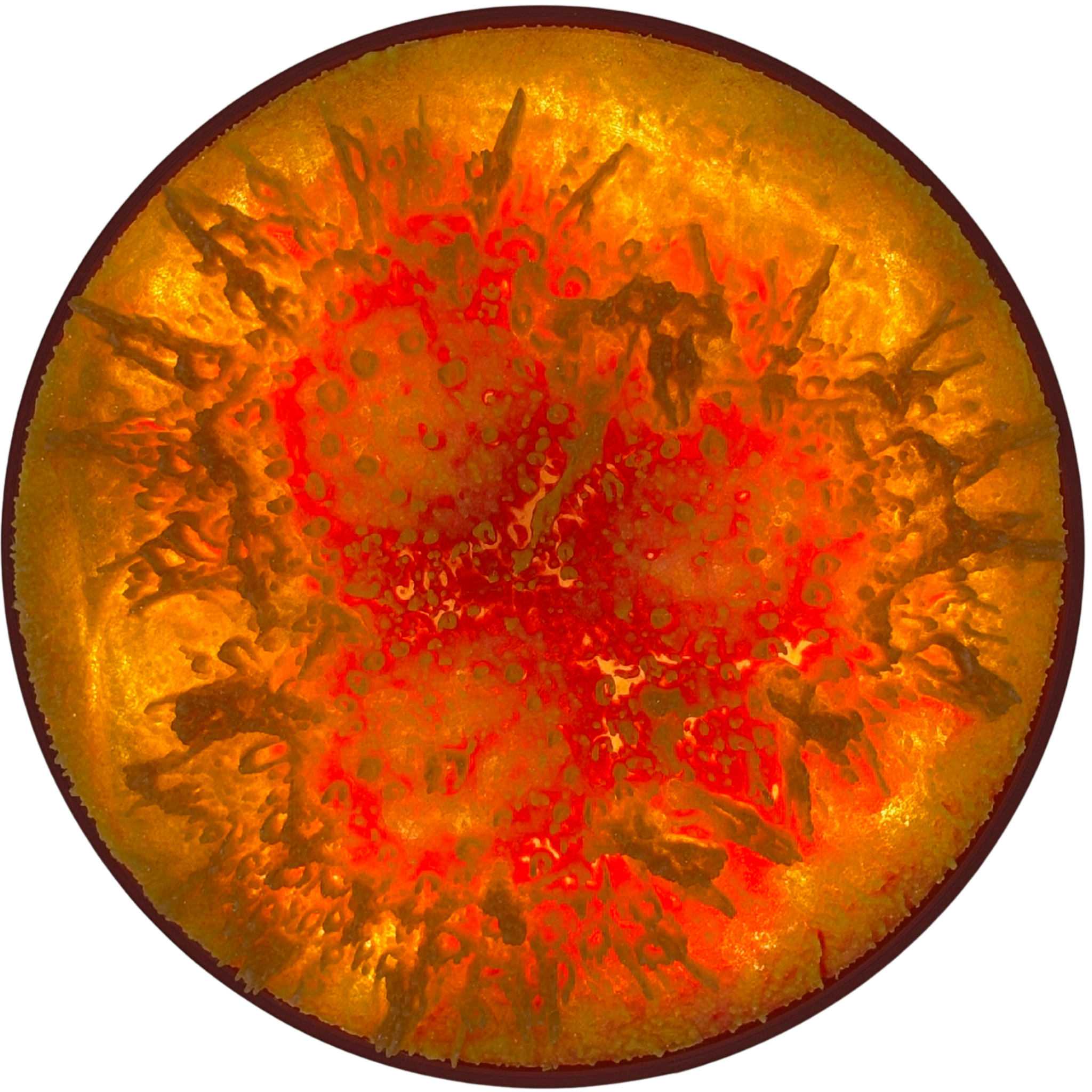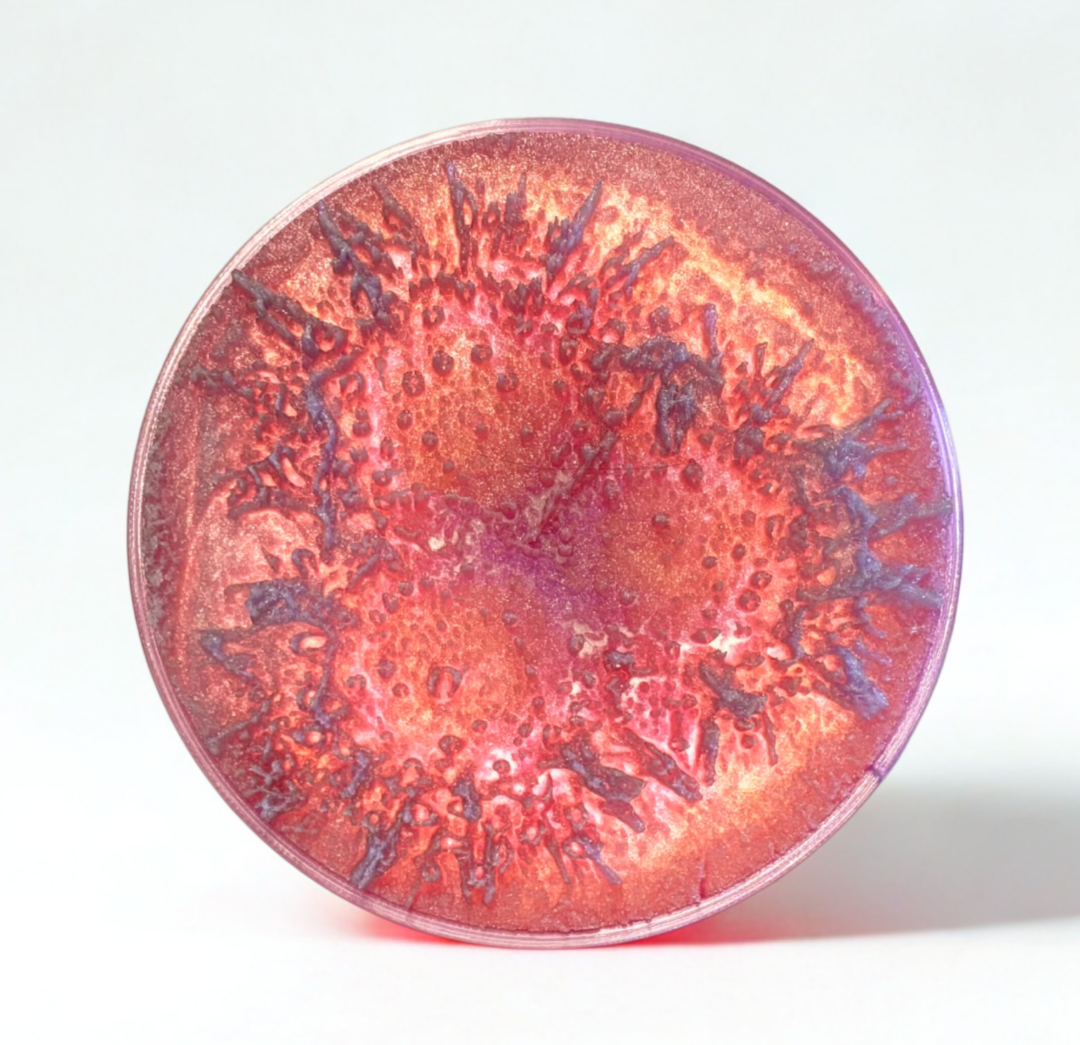 De petrischaal lamp maakt dit driedimensionale groeiproces zichtbaar en voelbaar.