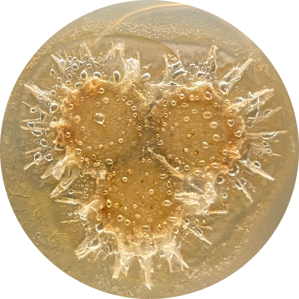 De Penicillium isariiforme kolonie hierboven heeft drie cirkelvormige groeifronten. Het zijn volwassen, sporenvormende zones. De spectaculaire kammen aan de buitenkant zijn kenmerkend voor P. isariiforme.